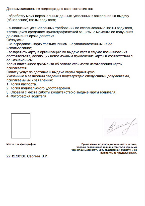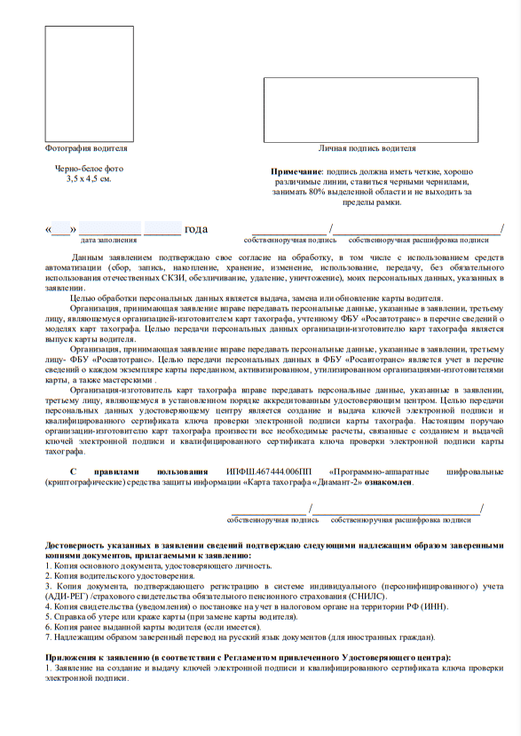 Бланк заявления имеет установленную форму, идентичную для всех организаций, которые занимаются изготовлением карт для тахографов.